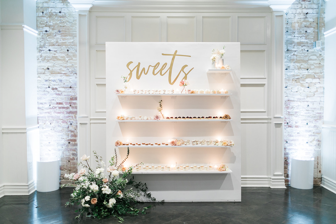 Cocktail hour consisted of delicious craft beverages including the couples signature drinks: A Greyhound and Hawaiian Mule. In The Attic, light bites were tray passed like Caprese Skewers and Filet and Wild Mushroom Wellingtons and cheese platters were available for guests to enjoy. After cocktail hour, everyone found their seat in The Crystal Ballroom by locating their name and table number handwritten on the gorgeous seating chart display made of pastel vases. Each table was decorated with light grey linens, blush table runner and napkins, candles, and clusters of floral arrangements. Friends and family shared toasts and ate a delicious dinner together before showing off their moves on the dance floor. A dessert display was devoured by those who had a hankering for something sweet and guests grabbed props and posed for pictures at a photo booth before sending off the happily married couple.