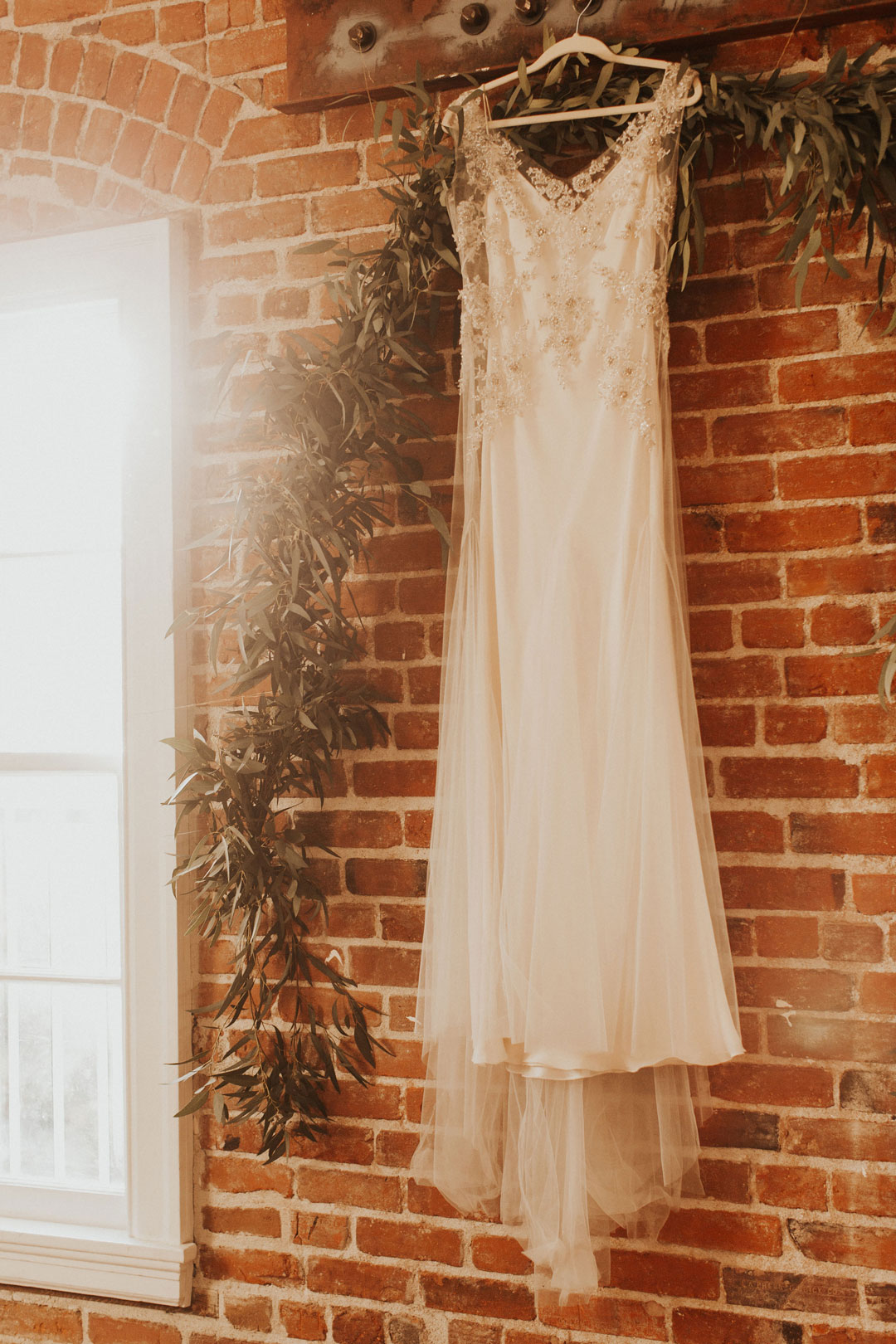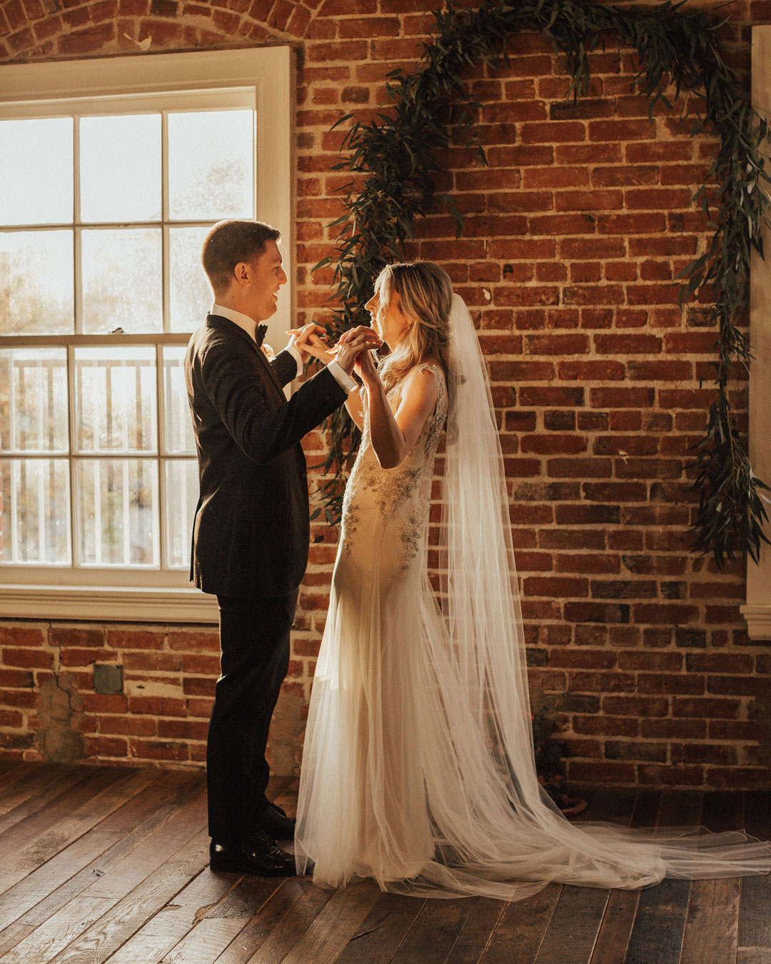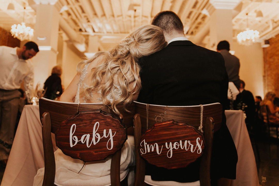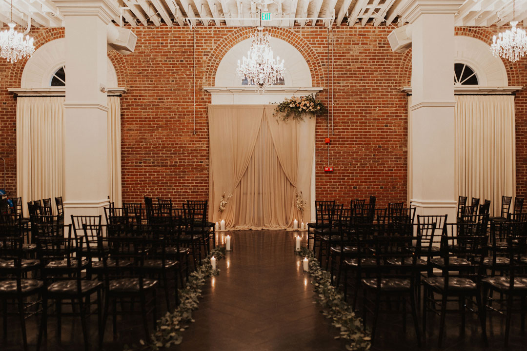 The sun was just setting on Danielle and Alex’s special day illuminating The Estate on Second in a golden glow. Personalized wooden signs and agate place cards added to the already warm, inviting space. The exposed brick walls made for a beautiful backdrop to exchange I dos.
