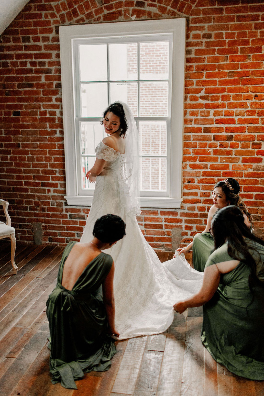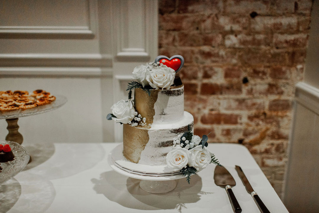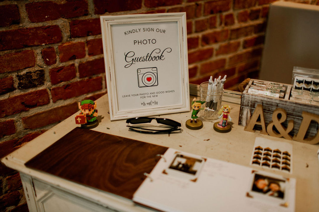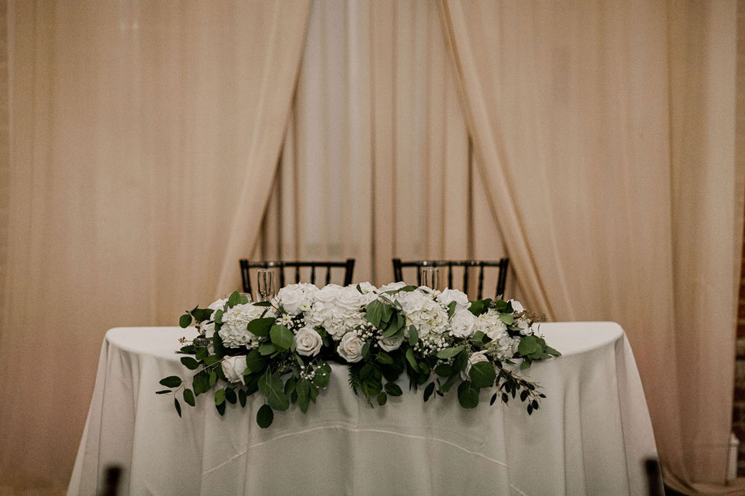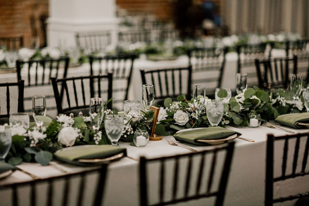 Alex turned to see his beautiful bride, Danielle, standing in front of him in a stunning off-the-shoulder, lace wedding dress for their first look. They shared a hug before their bridesmaids and groomsmen met them in The Attic at The Estate on Second. The groomsmen each wore a different colored tie and each bridesmaid wore an olive-green dress to match the décor for the wedding. After photos were taken of the group, they headed down to the Crystal Ballroom for the ceremony. Bits of greenery and white hydrangeas were incorporated into the ceremony décor and bridesmaids’ and bridal bouquet. Sweet vows were exchanged before guests were invited upstairs to The Attic for cocktail hour. Filet & Wild Mushroom Wellingtons along with Crab Cakes were tray passed while everyone mixed and mingled. Downstairs, tables were being set for dinner. Olive-colored napkins and gold flatware sat at each table setting along with more greenery and white florals. Things were winding down upstairs as guests checked the seating chart and made their way back downstairs for dinner. Santorini Chicken, Penne Alla Checca, Red Roasted Garlic Potatoes, Green Beans and Wild Cherry Salad were served buffet style as heartwarming toasts were bring made. After dinner, the bouquet and garter toss traditions were fulfilled,and the dessert station was unveiled with an assortment of French Macarons, Raspberry Chocolate Decadence, Fresh Fruit Tarts, Vanilla Bean Chocolate Eclairs and French Apple Tarts. The newlyweds also cut their chocolate cake with vanilla Bavarian filling and French buttercream icing before concluding their very special day.