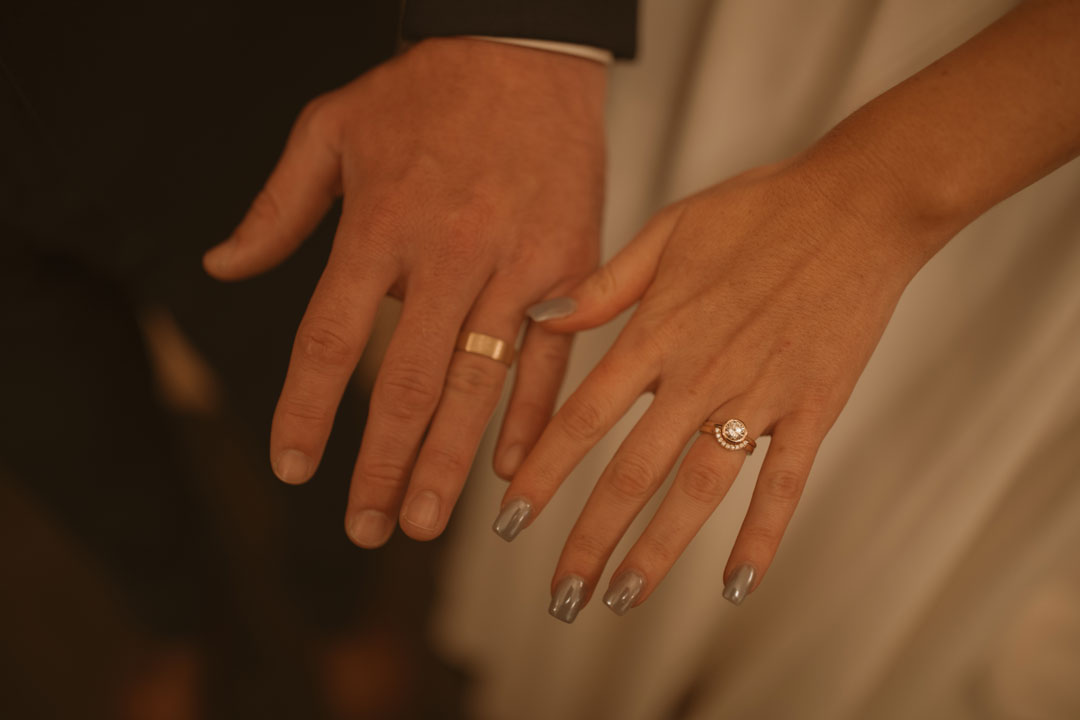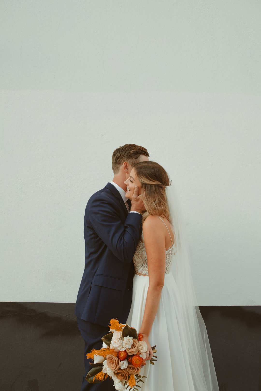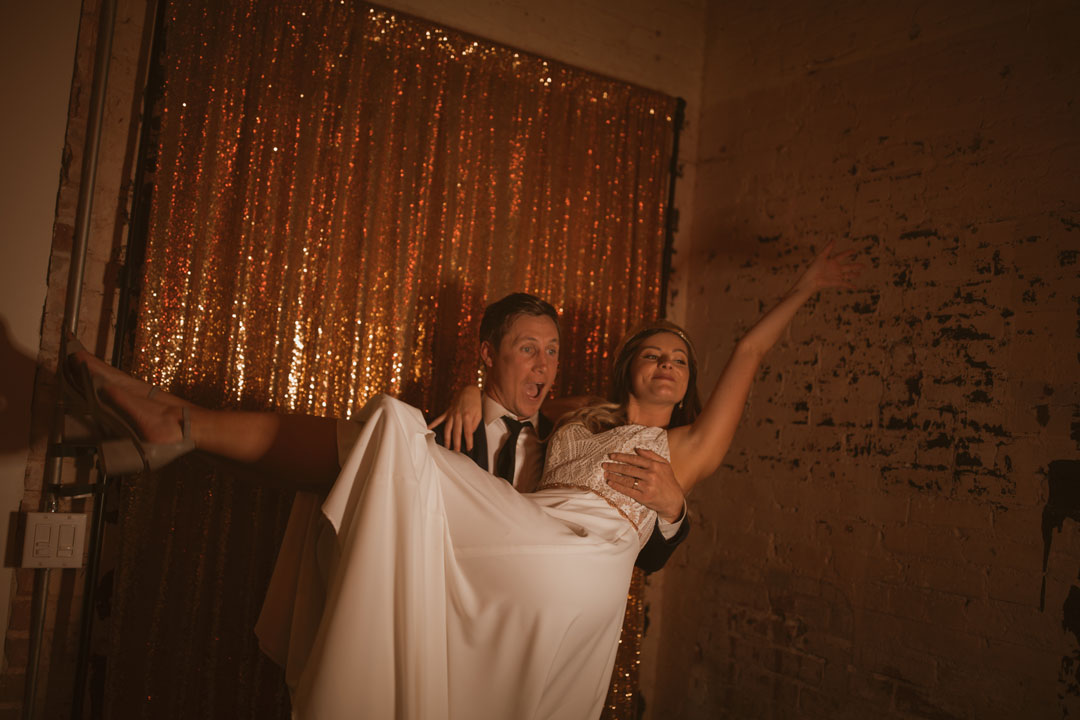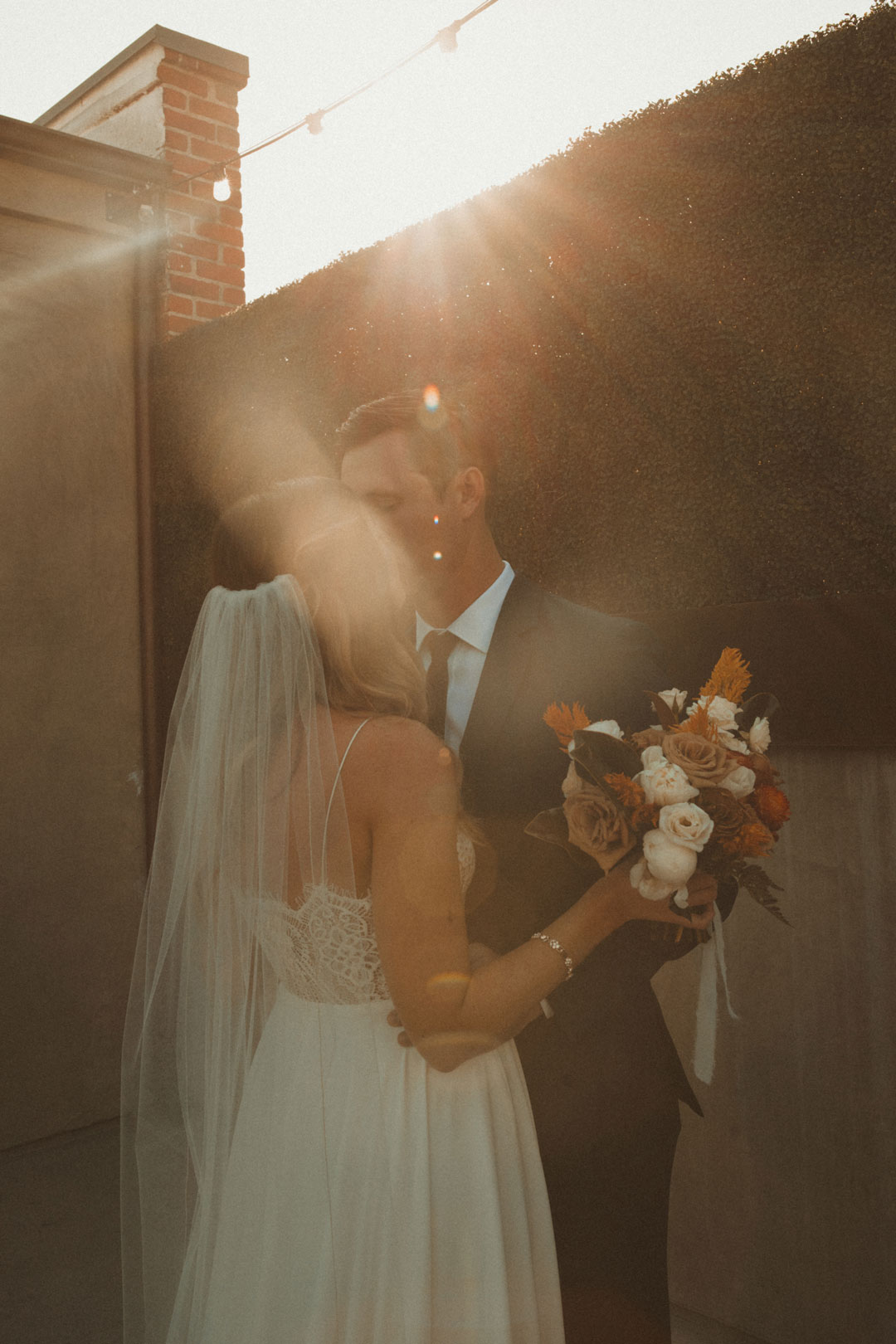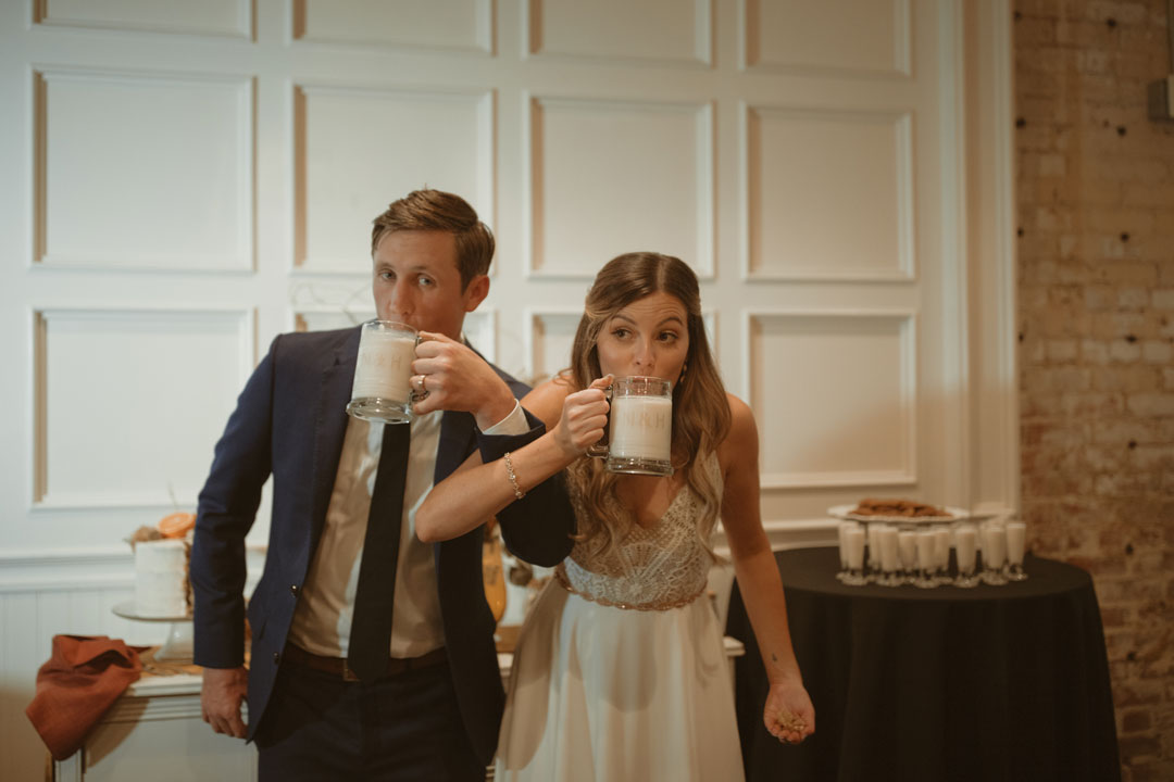 Nicole met Howard on the Terrace at The Estate on Second, tapped his shoulder, and awaited their first look. Howard turned toward his bride and emotion filled his face. He couldn’t hide the overwhelming love he was feeling, and neither could Nicole. Bridesmaids, groomsmen, and family met them for photos before the ceremony. The bridesmaids were dressed in rust orange maxi dresses and the groomsmen wore deep navy suits and black ties. The group made their way all around the venue to capture the perfect shots before making their way into the Crystal Ballroom. Guests were seated and the wedding party began their walk down the candlelit aisle. Nicole and Howard shared their own personal vows to one another, broke bread, and were pronounced husband and wife. Their friends and family cheered as they made their walk out of the Crystal Ballroom and into cocktail hour. Pomodoro Bruschetta and Ellie’s Parmesan Meatballs were tray passed and the bar opened serving the newlyweds signature cocktails, a Skinny Margarita and Old Fashioned. On the Terrace, a cigar lounge was set up for guests to enjoy throughout the night. Before long, everyone was called back down to the Crystal Ballroom for dinner. A buffet of Grilled Marinated Vegetables, Caesar Salad, Chicken Marsala, Roasted Italian Zucchini, and Tortellini with Creamy Pesto was unveiled. Guests ate their fill, then took part in fun activities like a photo booth, dancing on the dance floor, the cigar lounge and grabbing a Cookie & Milk Shot for something sweet. The unforgettable evening came to a close after sharing many memories and creating new ones.