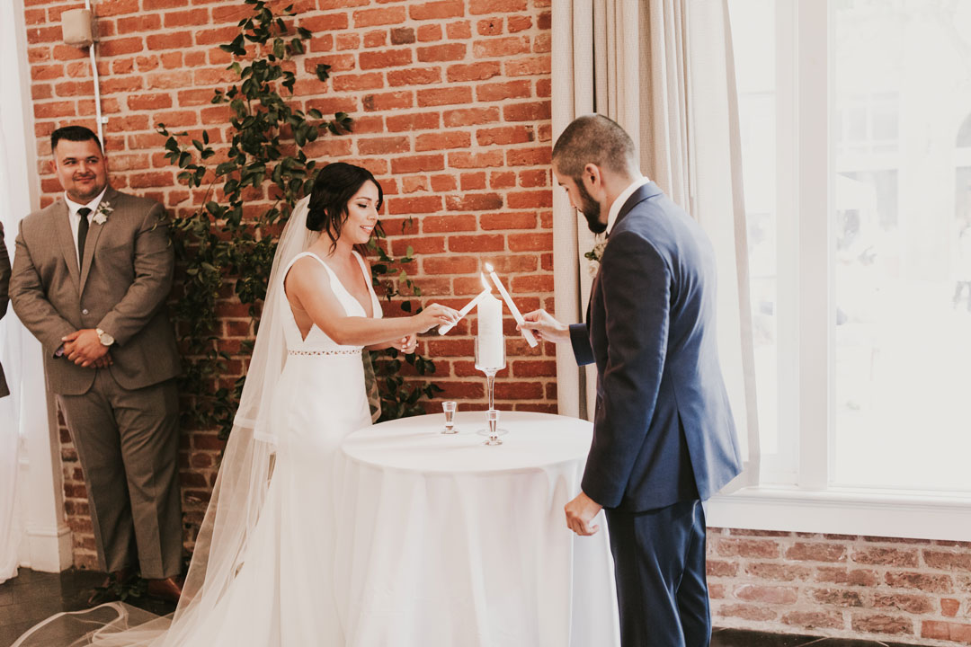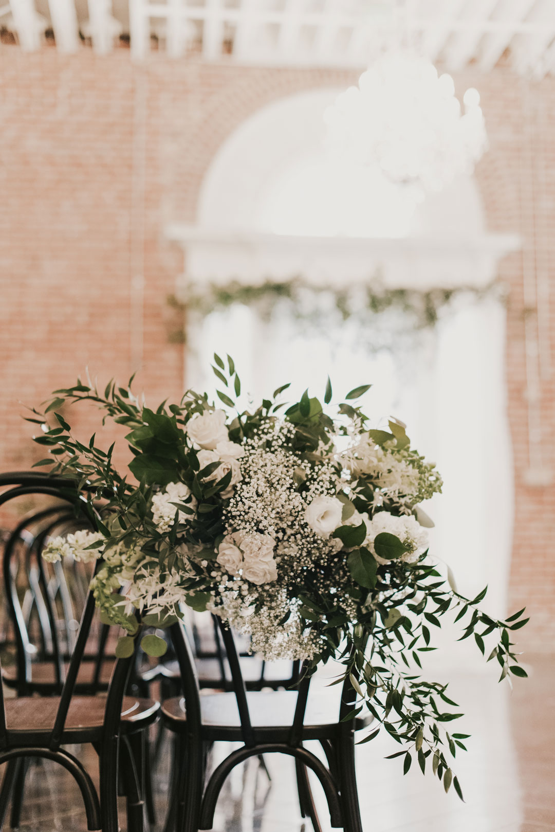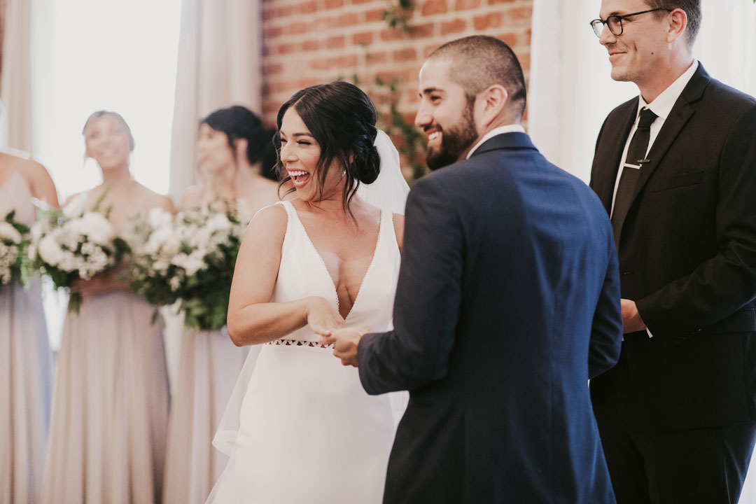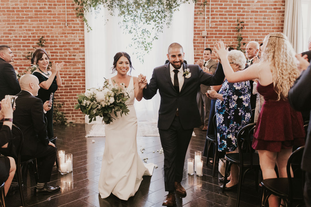 Sunlight soaked The Attic at The Estate on Second while the girls were putting final touches on Jessica’s gorgeous bridal look. Her white wedding gown with dainty neckline trim fit her like a glove while her veil cascaded behind her. The boys grabbed a beer and shared a few laughs as guests arrived and took their seats inside The Crystal Ballroom. The ballroom was decorated in organic greenery crawling up the walls to the ceiling and along our center Palladian window. Candles marked the sides of the aisleway while white carnations were lightly scattered around and bouquets of baby’s breath, white roses and a lush mixture of leaves clung to the back of chairs. Jessica made her way down the aisle to a teary-eyed groom. They each read personalized vows to one another and shared a kiss to end their ceremony. With huge smiles on their faces, they walked down the aisle and out of the ballroom into cocktail hour.