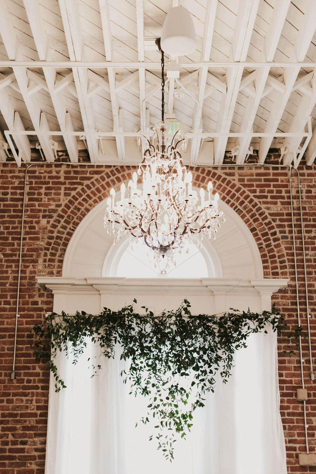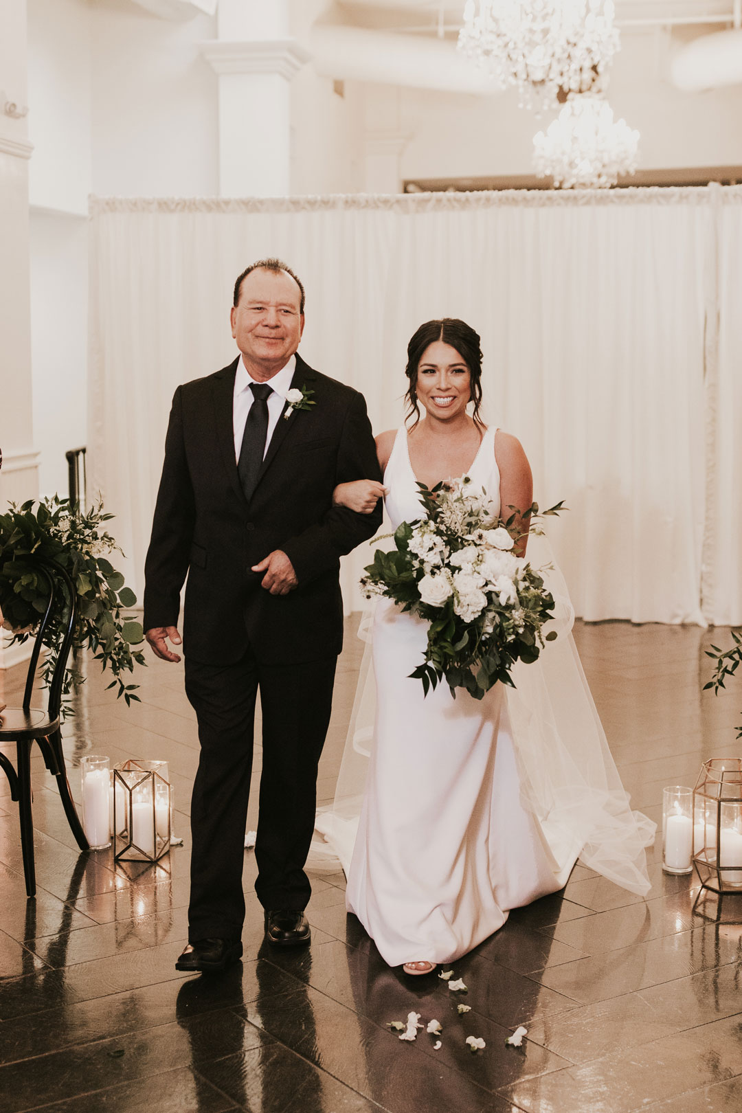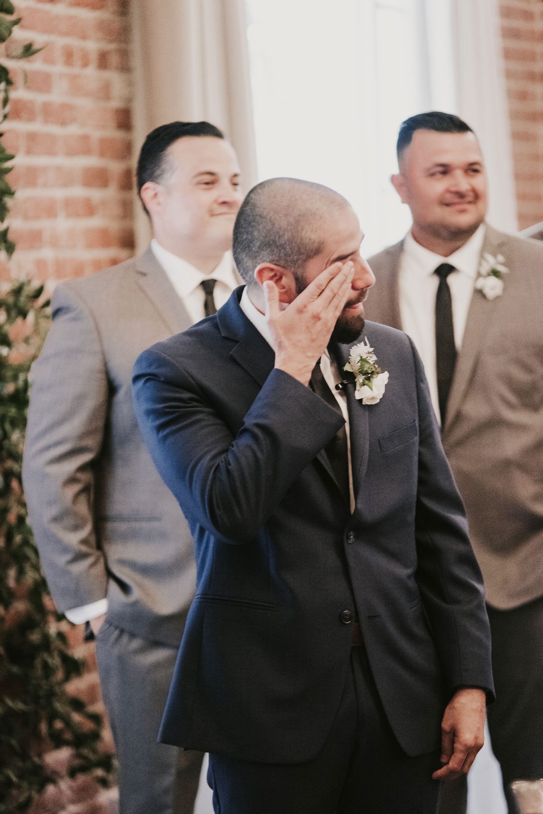 Sunlight soaked The Attic at The Estate on Second while the girls were putting final touches on Jessica’s gorgeous bridal look. Her white wedding gown with dainty neckline trim fit her like a glove while her veil cascaded behind her. The boys grabbed a beer and shared a few laughs as guests arrived and took their seats inside The Crystal Ballroom. The ballroom was decorated in organic greenery crawling up the walls to the ceiling and along our center Palladian window. Candles marked the sides of the aisleway while white carnations were lightly scattered around and bouquets of baby’s breath, white roses and a lush mixture of leaves clung to the back of chairs. Jessica made her way down the aisle to a teary-eyed groom. They each read personalized vows to one another and shared a kiss to end their ceremony. With huge smiles on their faces, they walked down the aisle and out of the ballroom into cocktail hour.