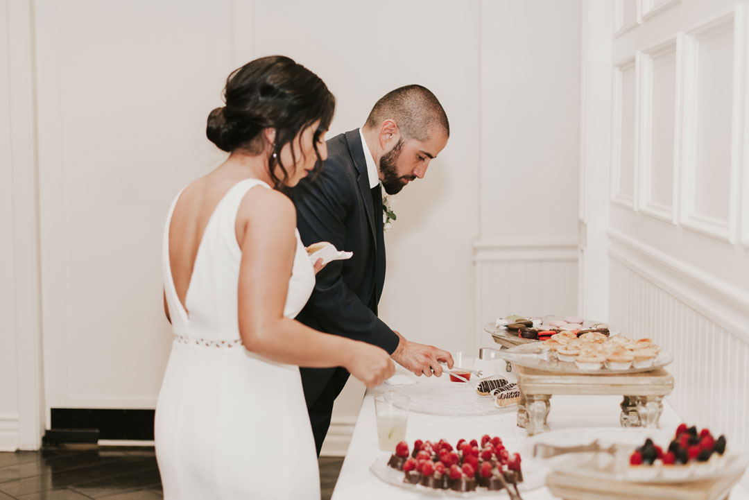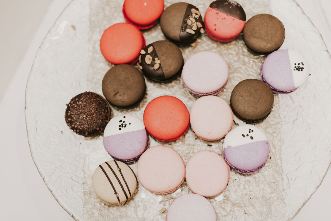 Guests were invited to snack on Caprese Skewers with Pesto & Basil and Fontina Cheese, Caramelized Onion, Sundried Tomato, and Pancetta Flatbread Pizza while the wedding party took pictures. The bar also opened and was pouring beer, wine, and the newlyweds signature cocktails: An Old Fashioned and Hawaiian Mule. After about an hour of mingling, everyone made their way inside to their seats for the reception portion of the evening. The green and white theme continued across each tabletop with garland and floral placements. The wedding party make their grand entrance, toasts were made, and dinner was served. Grilled Marinated Vegetables, Caesar Salad, Tortellini with Creamy Pesto, Chicken Parmigiana, and Roasted Italian Zucchini filled guests’ plates before Jessica and Bryan cut their wedding cake. The cake was shared only by the bride and groom and the lucky guests got to indulge in our Classic Dessert Station with an assortment of French Macarons, Raspberry Chocolate Decadence, Fresh Fruit Tarts, Vanilla Bean Chocolate Eclairs and French Apple Tarts.