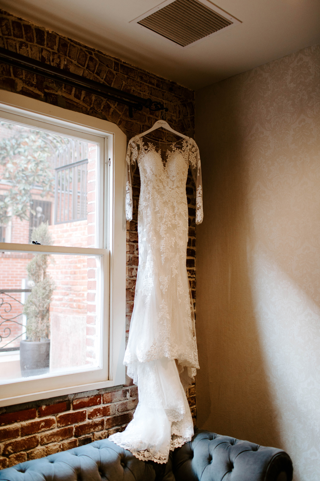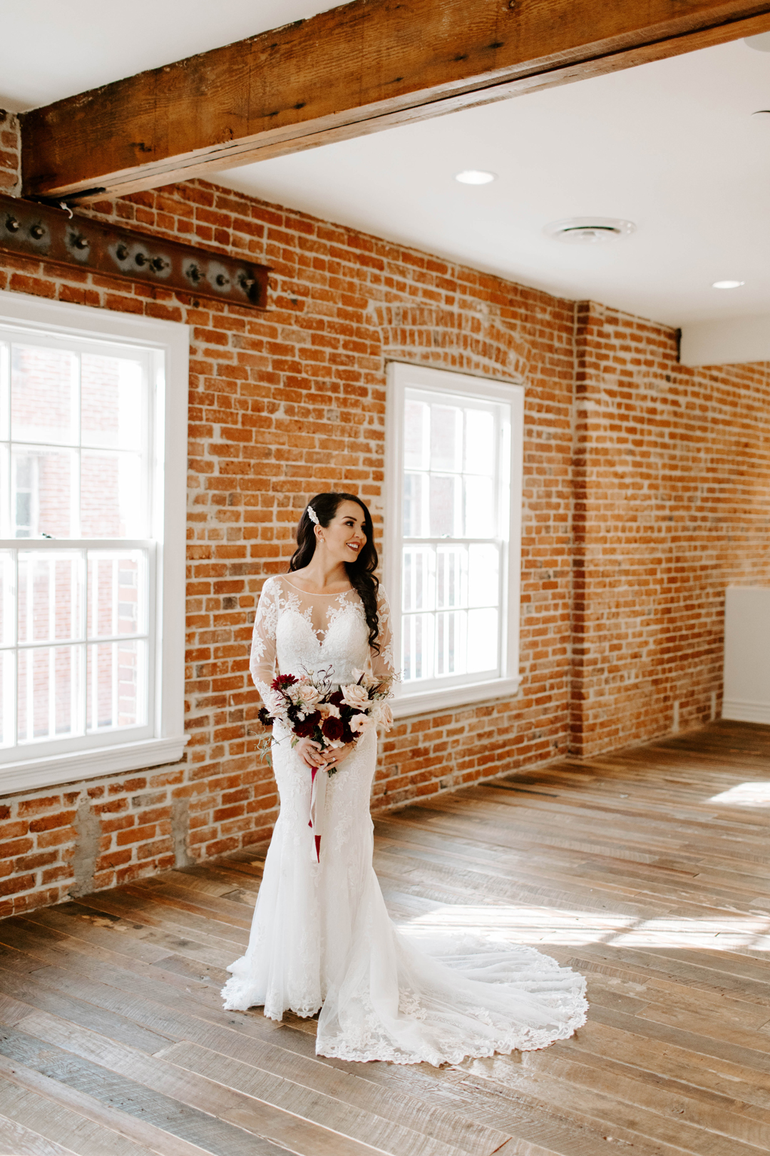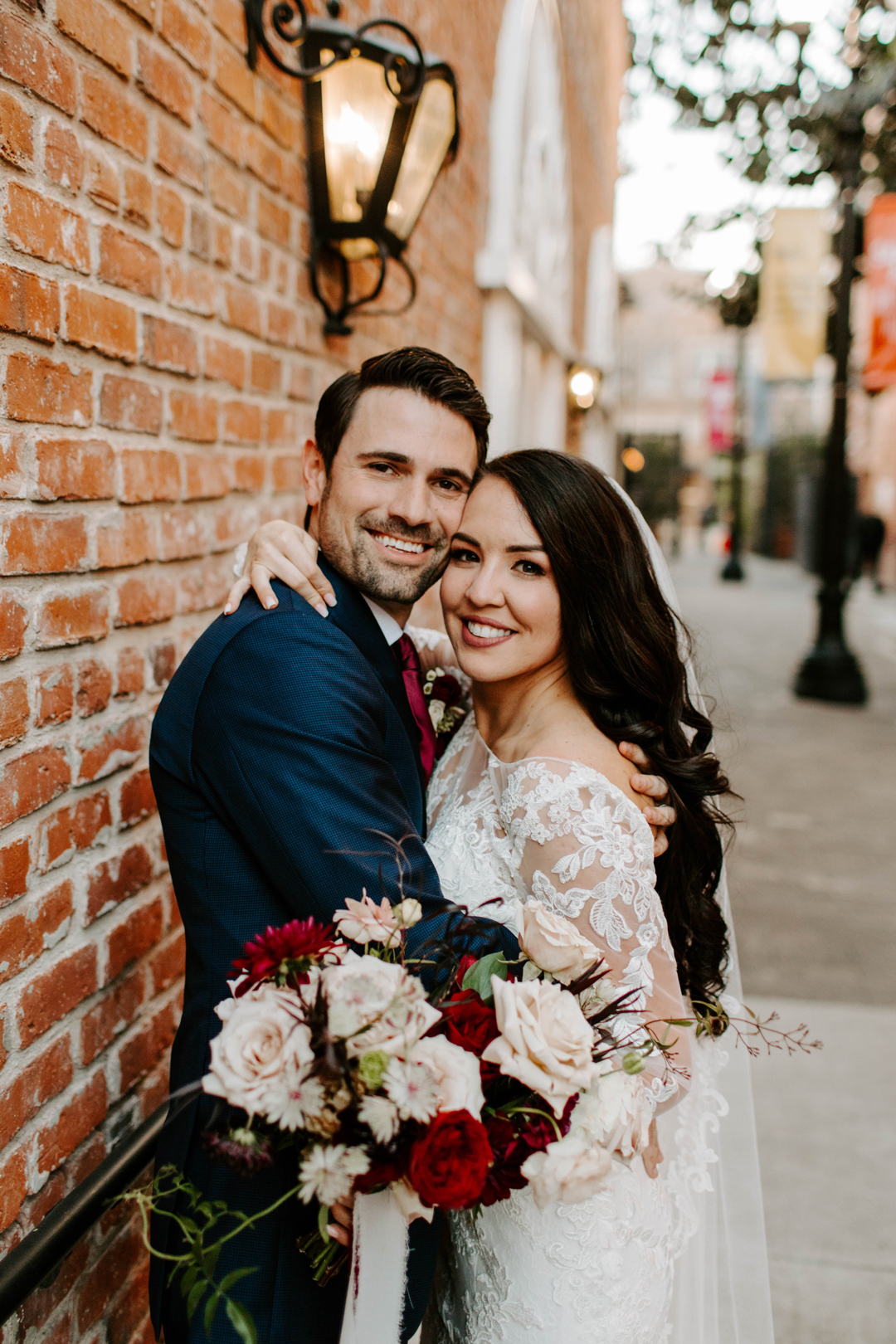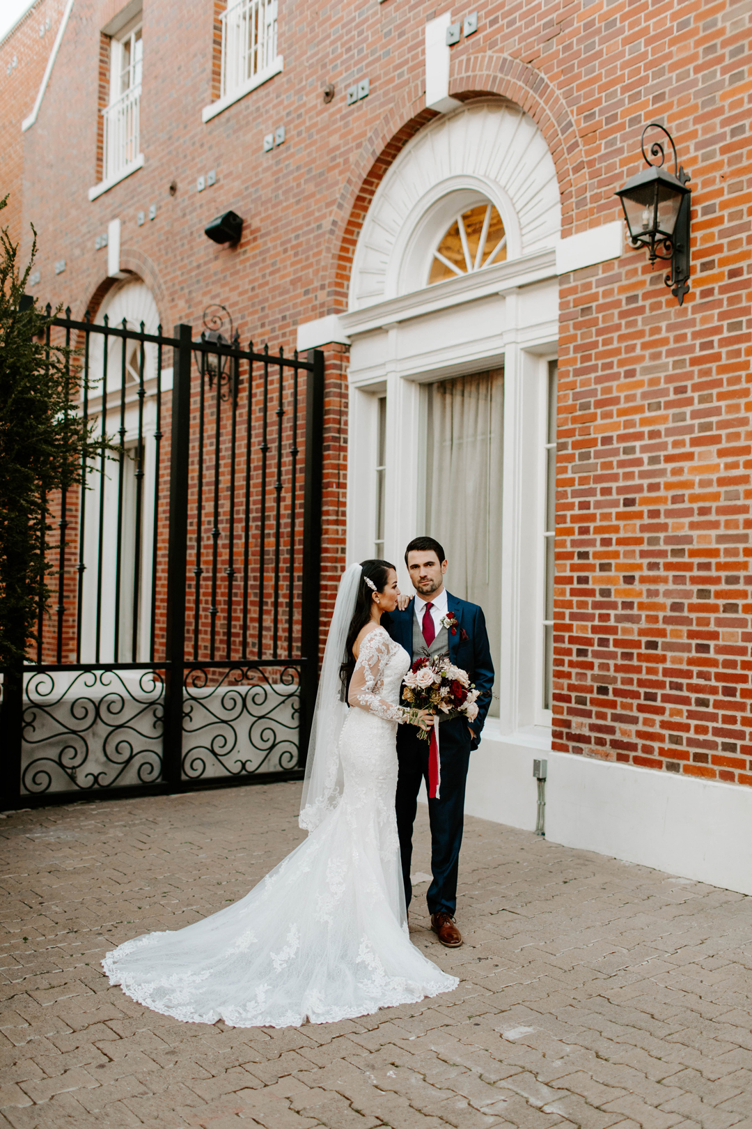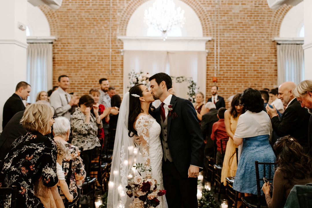 Jessica slipped into her long sleeve lace wedding gown in The Suite at The Estate on Second with her bridesmaids by her side just before heading up to The Attic to exchange first looks with Doug. She gracefully made her way upstairs and over to her soon to be husband who was grinning ear to ear when he turned around to see his beautiful bride. The two spent a few moments together before heading down to the Crystal Ballroom awaiting their walks down the aisle. The Crystal Ballroom was decorated in greenery and candles lining the aisle-way and a leafy floral arch where the bride and groom would stand in front of family and friends. Guests were seated and the music began as the wedding party made their way to their marks. Jessica was last to walk out arm in arm with her father to the head of the aisle. After the giving of the bride, Doug and Jessica exchanged their vows and attendees cheered as they ended the ceremony with a kiss. Cocktail hour was held in The Attic and outside on The Terrace before the dinner reception downstairs back in The Crystal Ballroom. After dinner, toasts and cake cutting, everyone danced the night away before the send off.