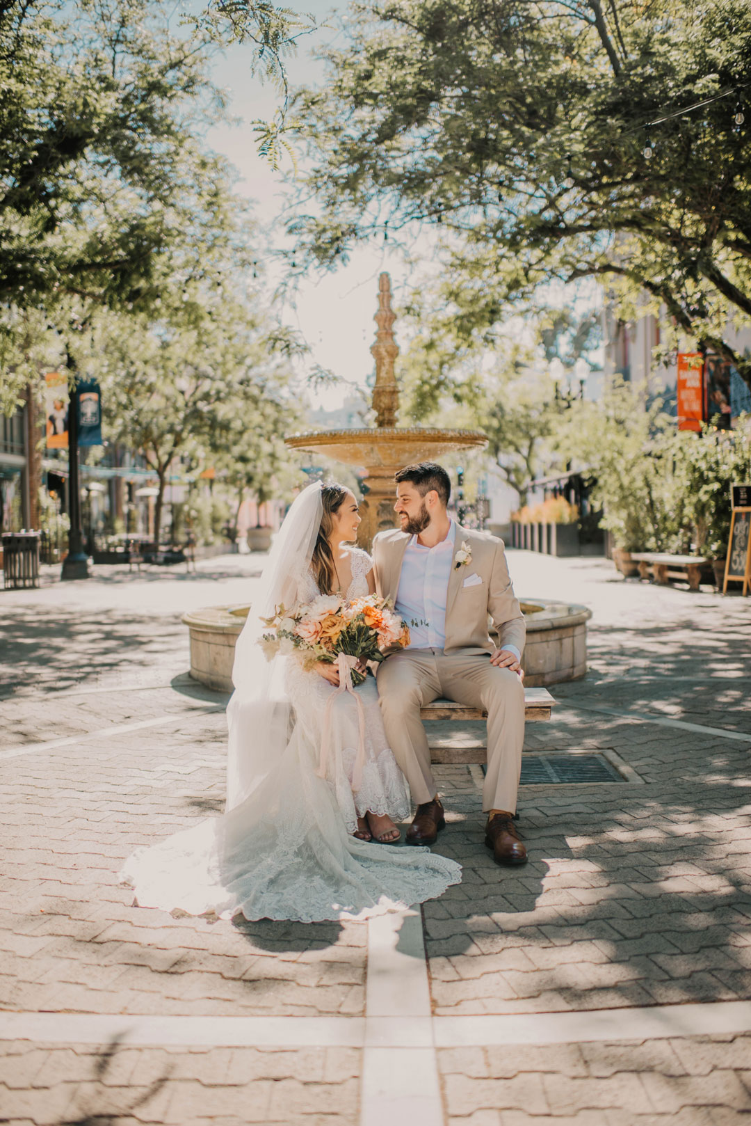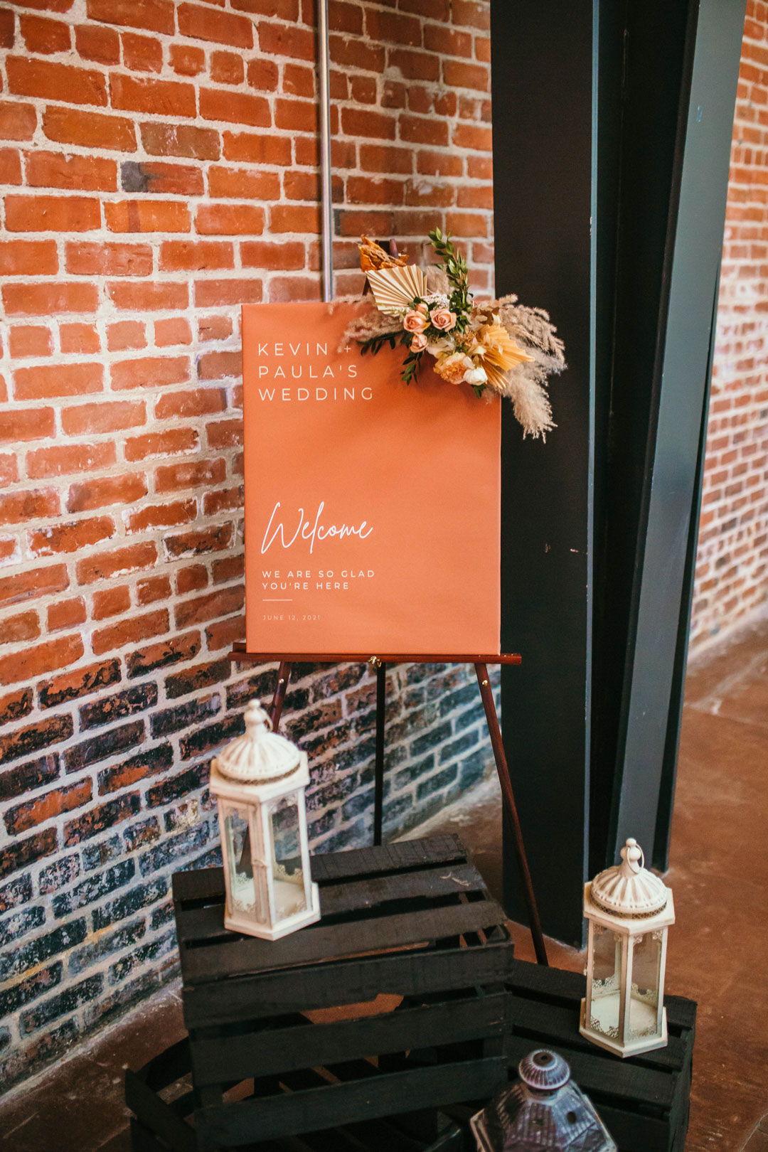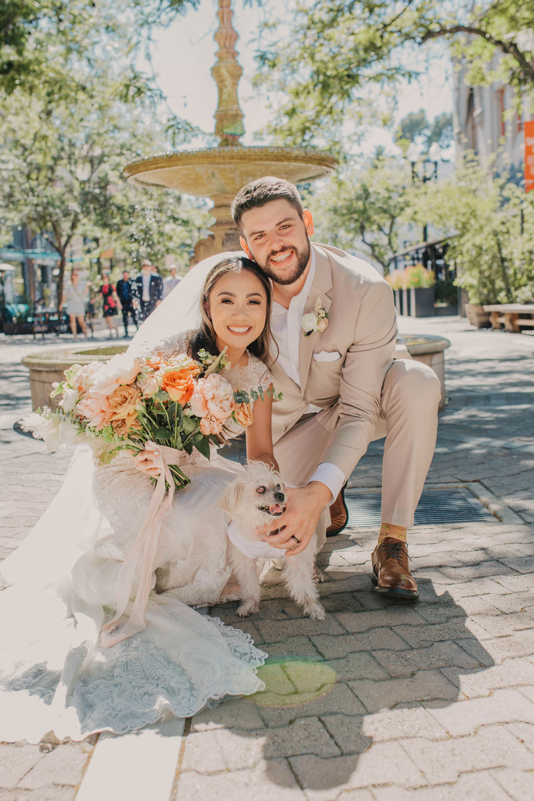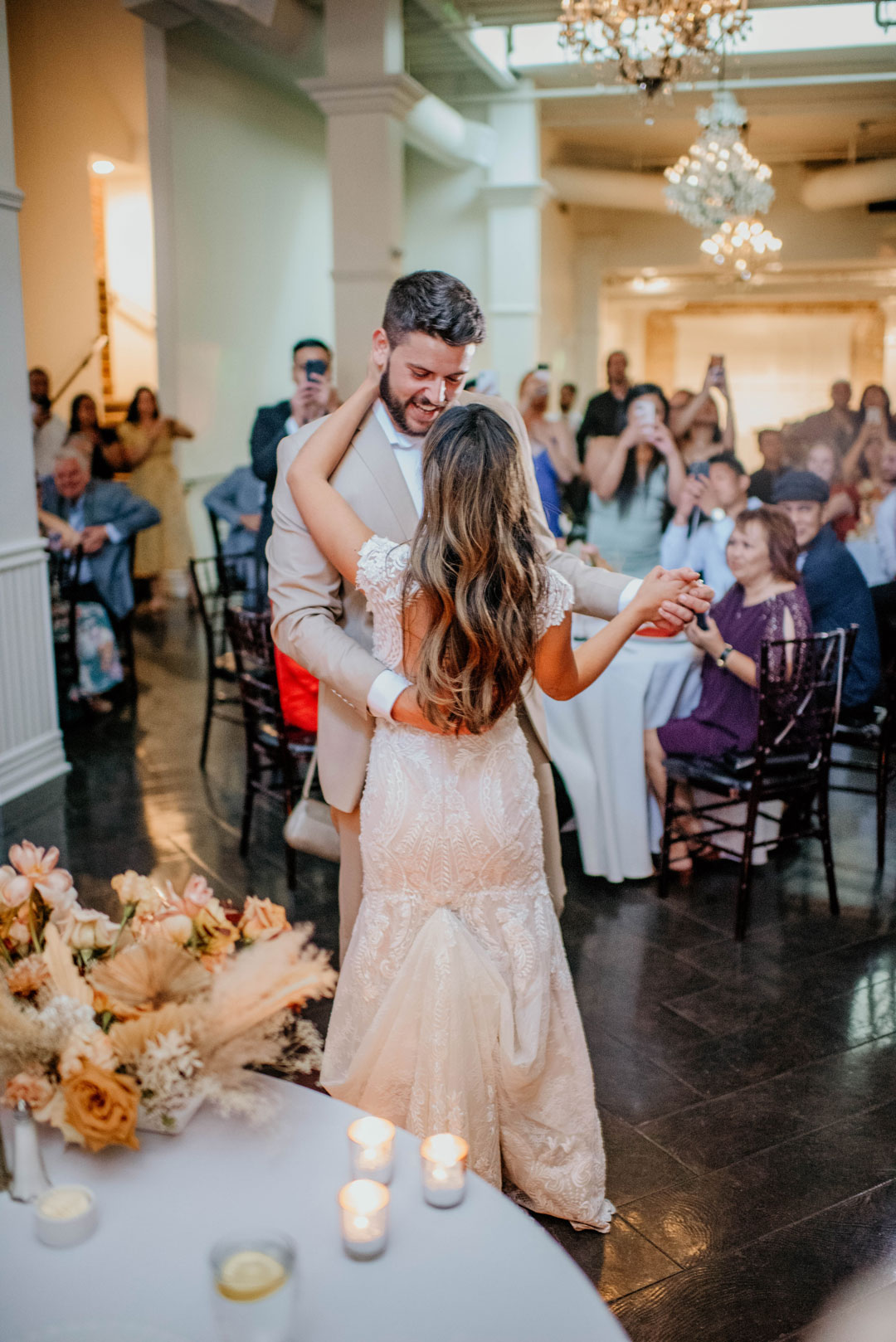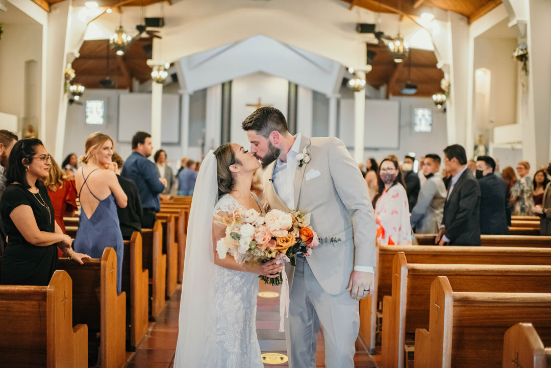 A sweet kiss sealed the deal at their local church before Kevin and Paula headed to The Estate on Second for cocktail hour and their wedding reception. The wedding party met outside by the Chiarini Fountain for group photos while guests made a beeline to the food and drink inside. All the bridesmaids wore different dresses ranging in shades of pink and orange to match their bouquets. The groomsmen and groom all wore the same beige suits, white button-ups, and brown shoes. The girls posed, the guys posed, then the group posed together creating memories that will last a lifetime for the bride and groom. Kevin and Paula concluded the portrait session together before joining their guests inside for the remainder of cocktail hour where Filet & Wild Mushroom Wellingtons and Brioche Box hors d’oeuvres were served. Beer, wine, and the newlywed’s signature cocktails, a Moscow Mule and Old Fashioned, were poured at the bar while everyone mixed and mingled.