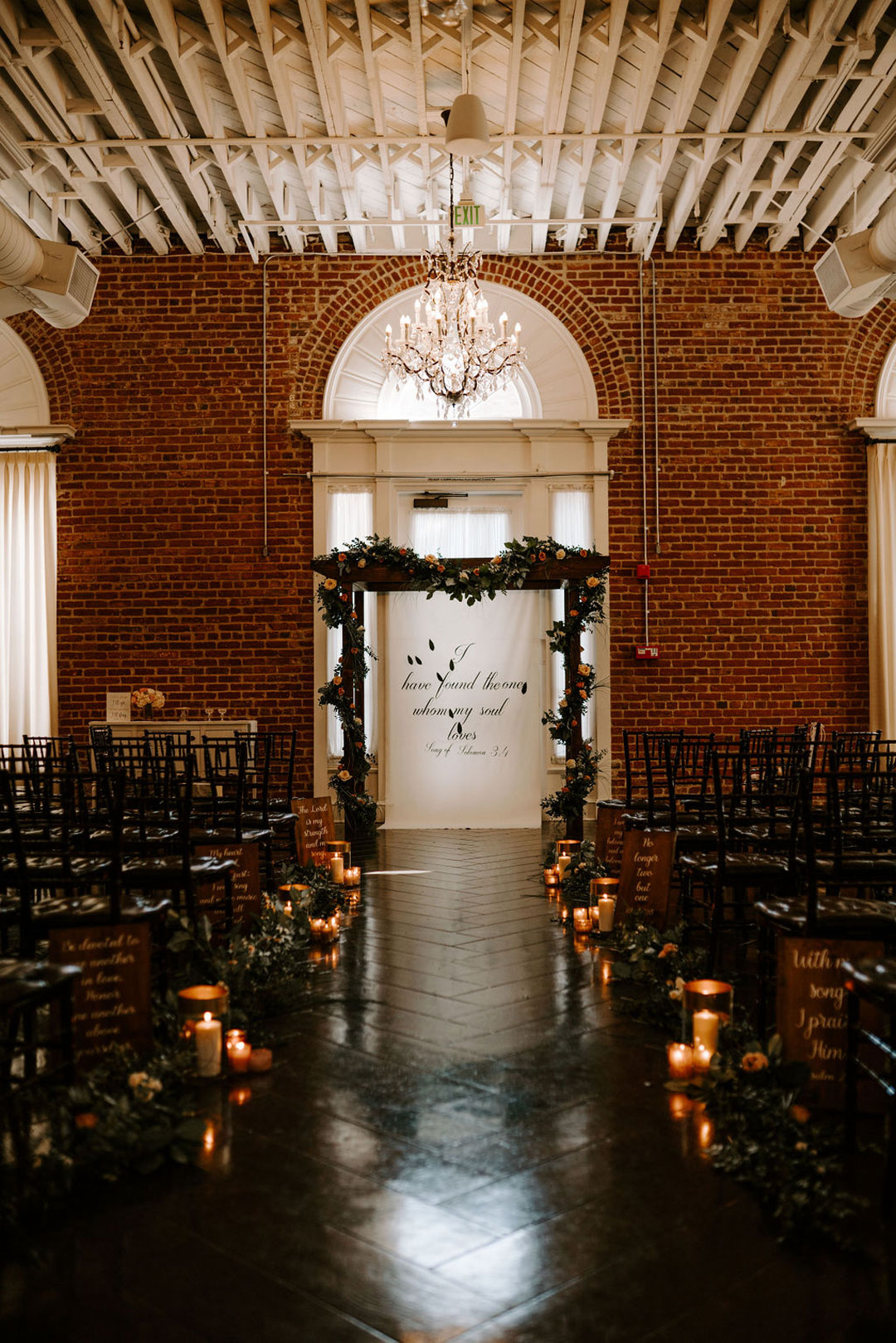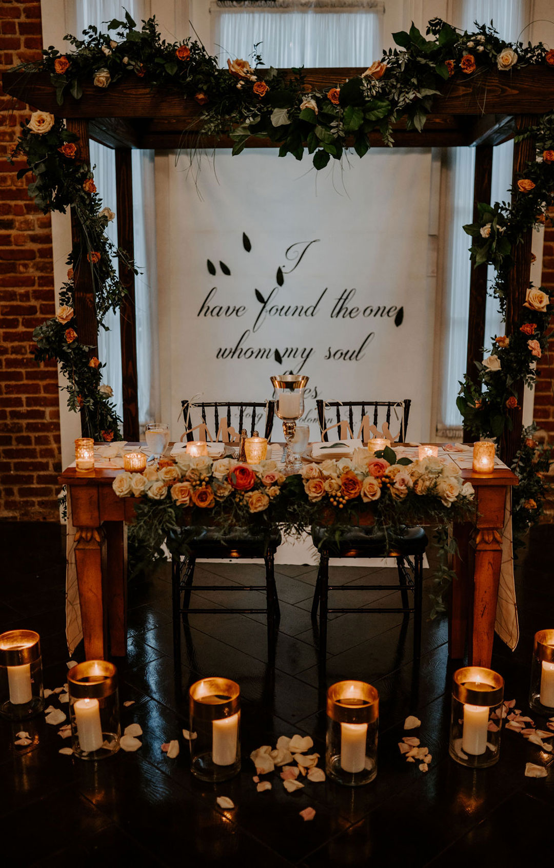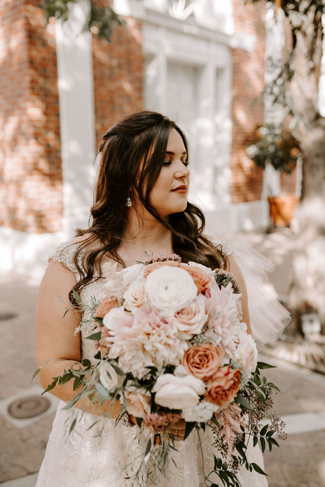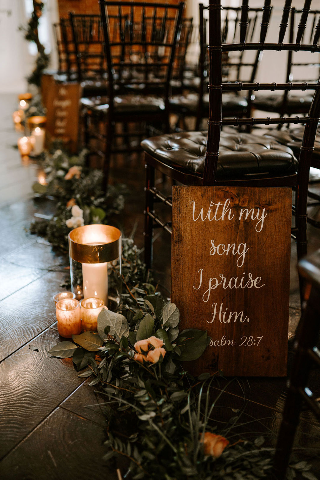Teague and Caleb, surrounded by loving friends and family, tied the knot at The Estate on Second. A beautiful ceremony space was set up and guests’ eyes were instantly drawn to the aisleway lined with an assortment of candles, garland and endearing handwritten verses on wooden boards leading to the altar. The most gorgeous shades of peachy-pink roses and hydrangeas decorated the space and complimented the soft pink bridesmaid dresses. I dos were exchanged, and Teague and Caleb walked past their guests beaming with happiness.