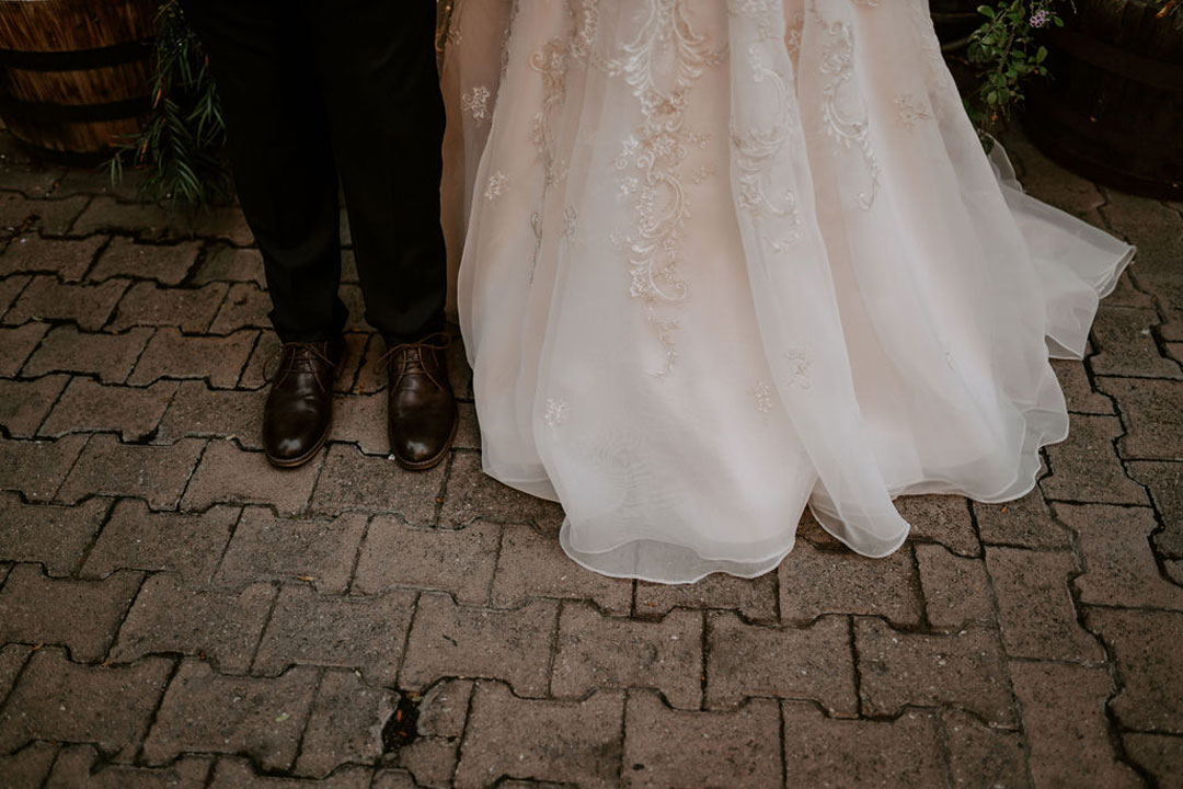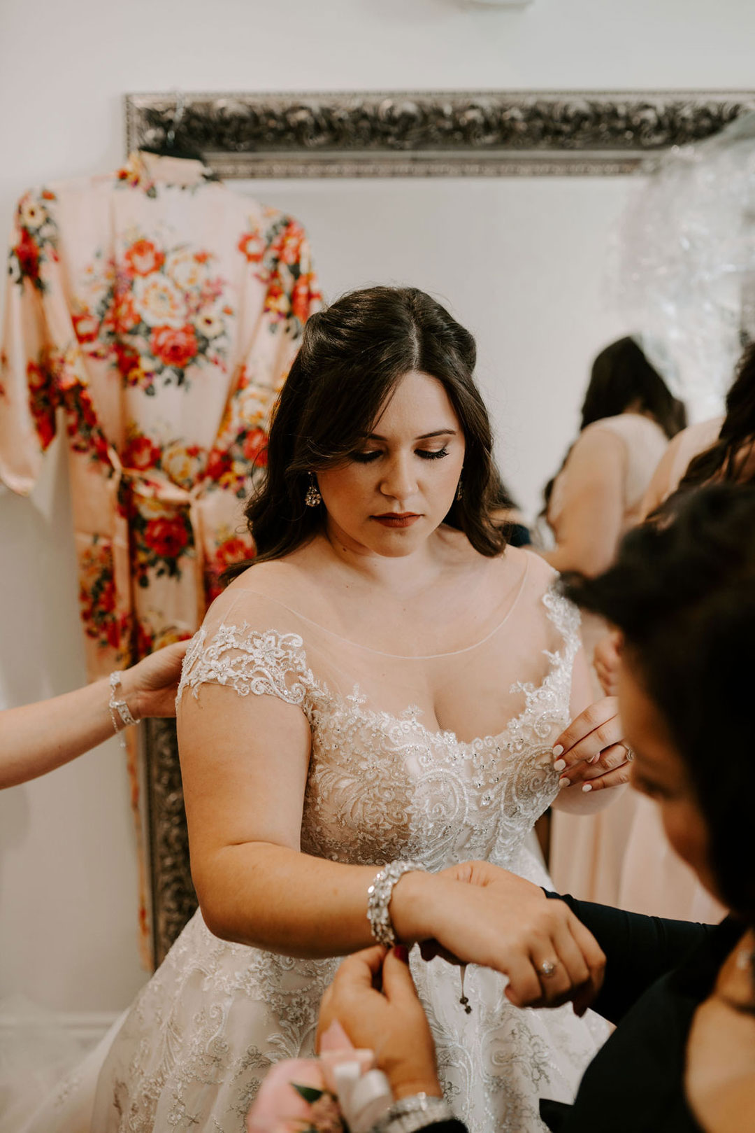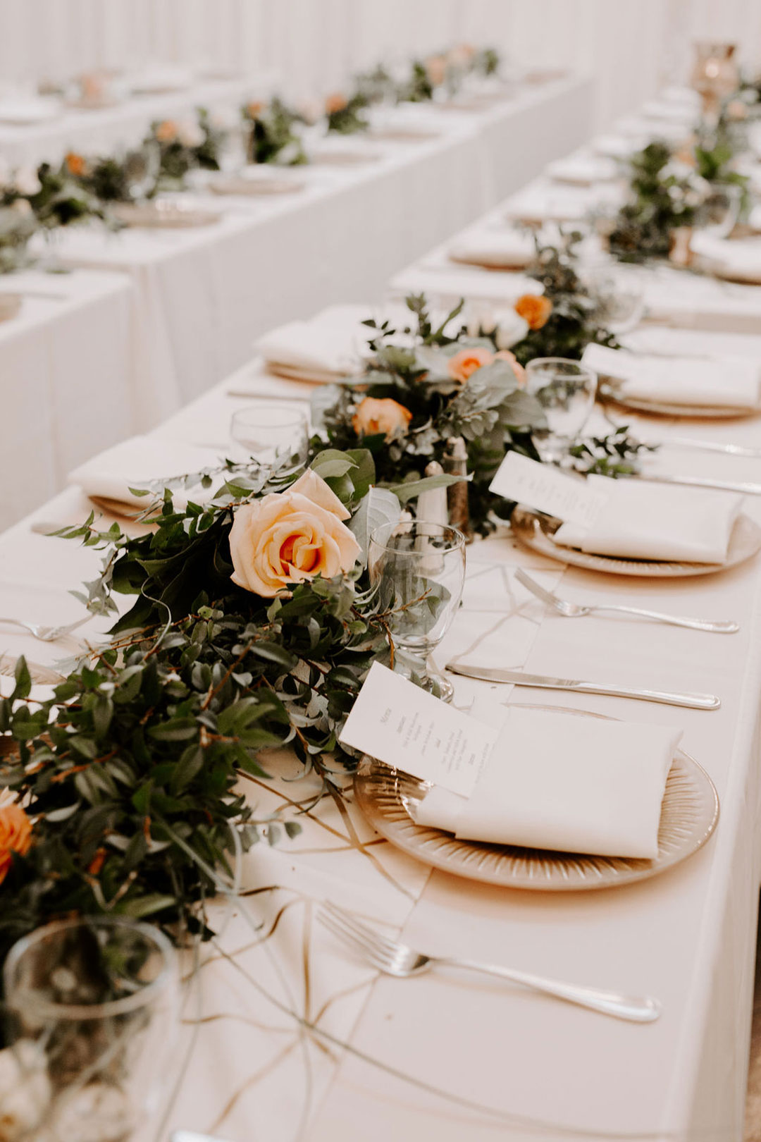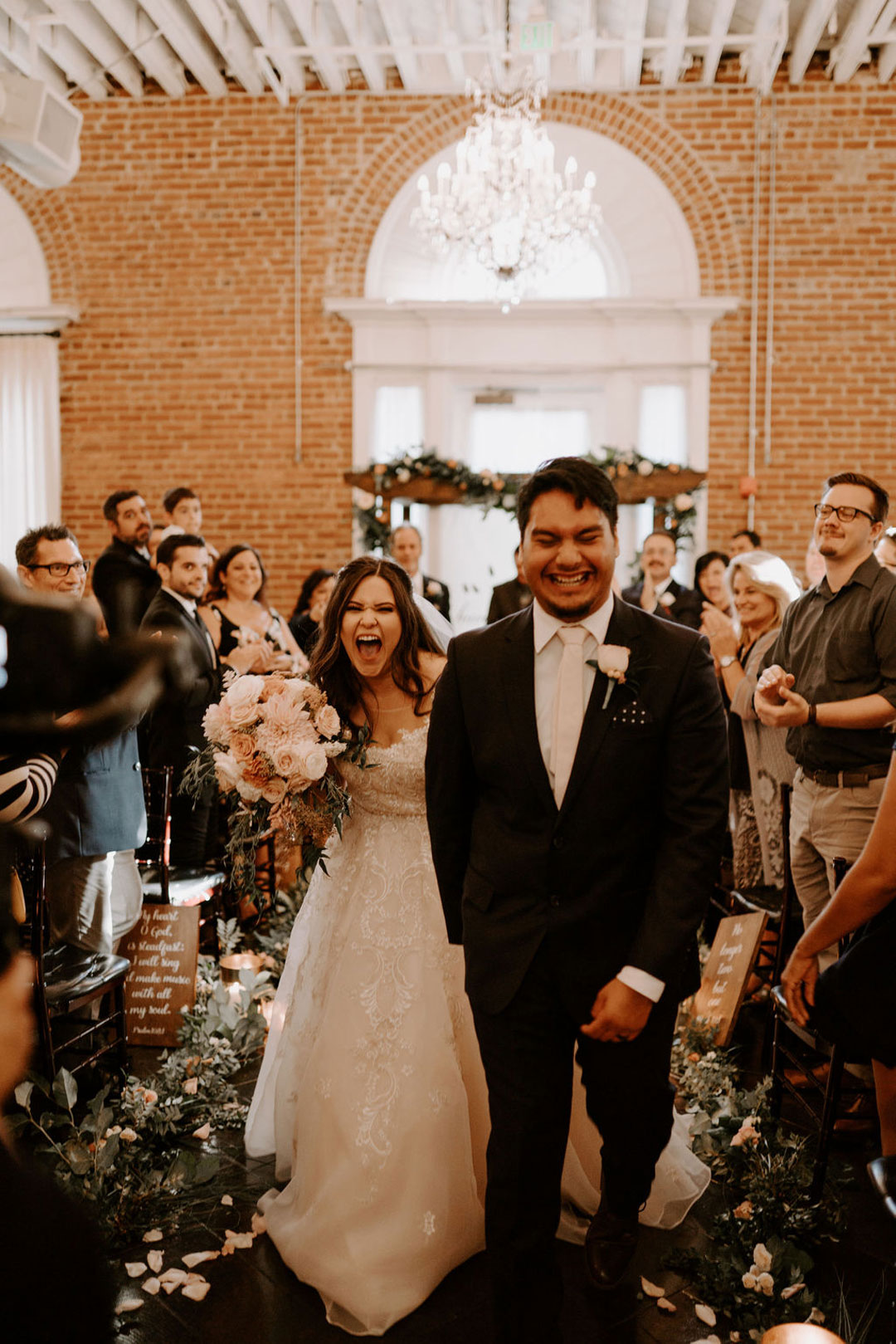 Teague and Caleb, surrounded by loving friends and family, tied the knot at The Estate on Second. A beautiful ceremony space was set up and guests’ eyes were instantly drawn to the aisleway lined with an assortment of candles, garland and endearing handwritten verses on wooden boards leading to the altar. The most gorgeous shades of peachy-pink roses and hydrangeas decorated the space and complimented the soft pink bridesmaid dresses. I dos were exchanged, and Teague and Caleb walked past their guests beaming with happiness.