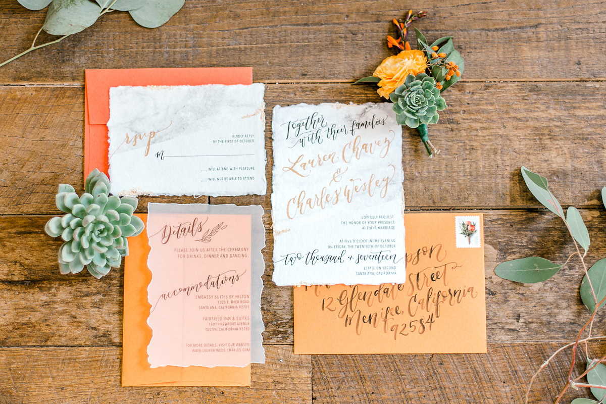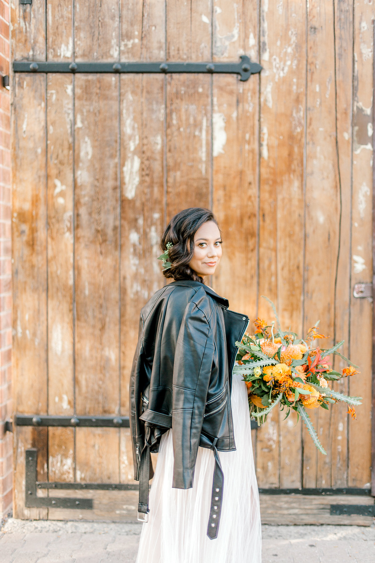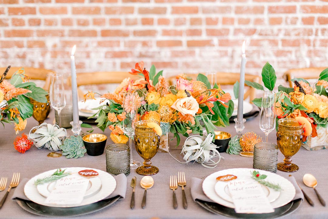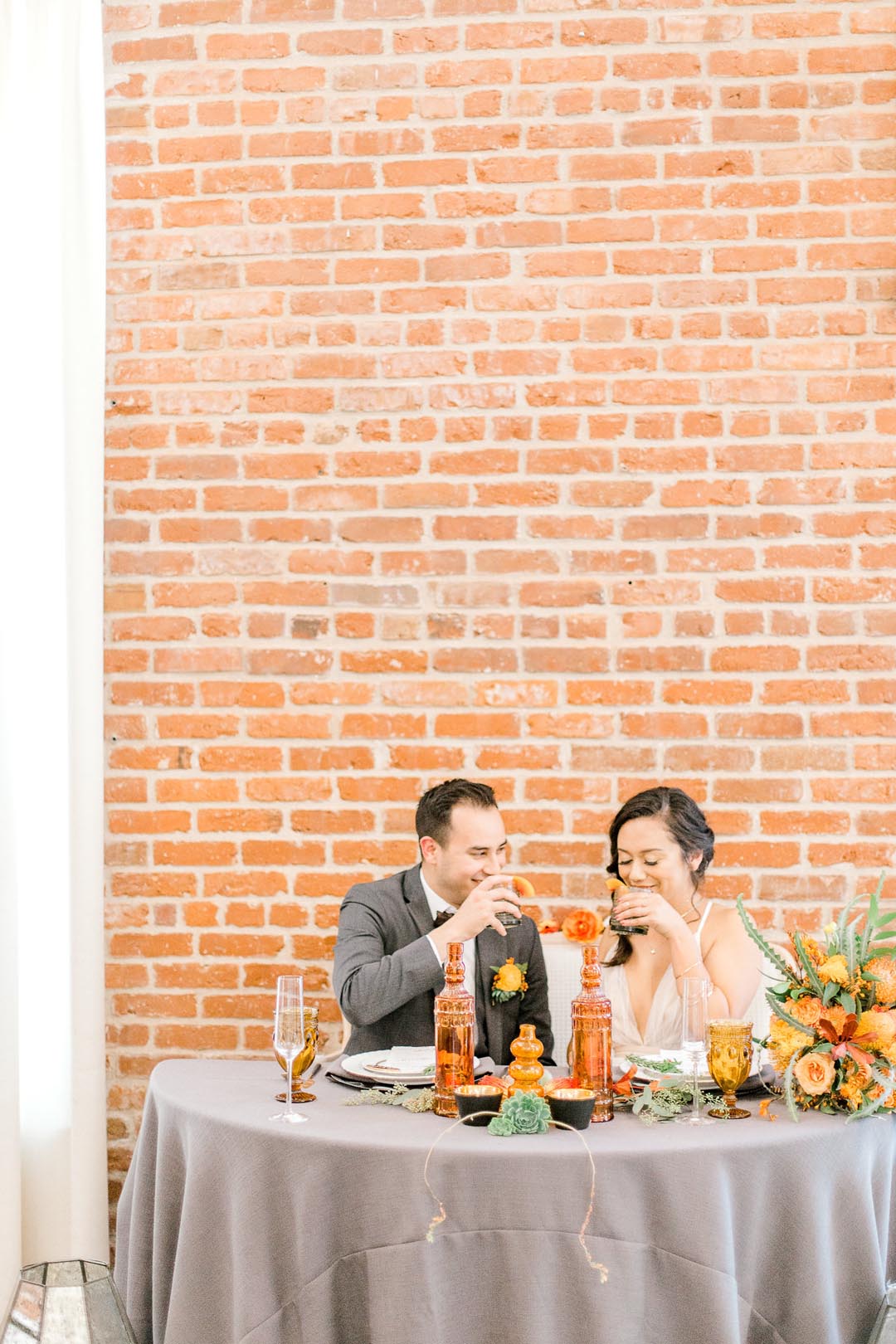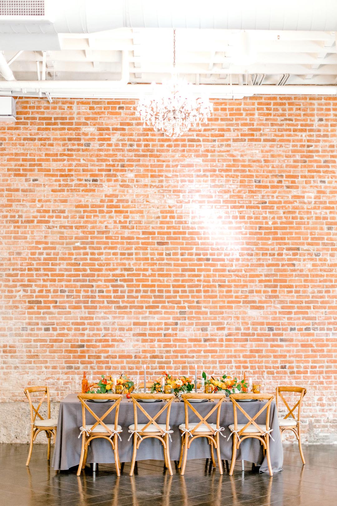 Events by the Cea transformed The Estate on Second into the industrial chic space of our dreams. Details including fresh orange florals, agate, distressed wooden chairs, succulents, and greenery engulfed our venue leaving the space nothing short of jaw dropping. With help from The Floral Story Co, Baker Party Rentals, and Events by the Cea, we were able to take our perfect blank canvas that is The Estate and turn it into an elegant, swoon-worthy setup as featured on The Perfect Palette.